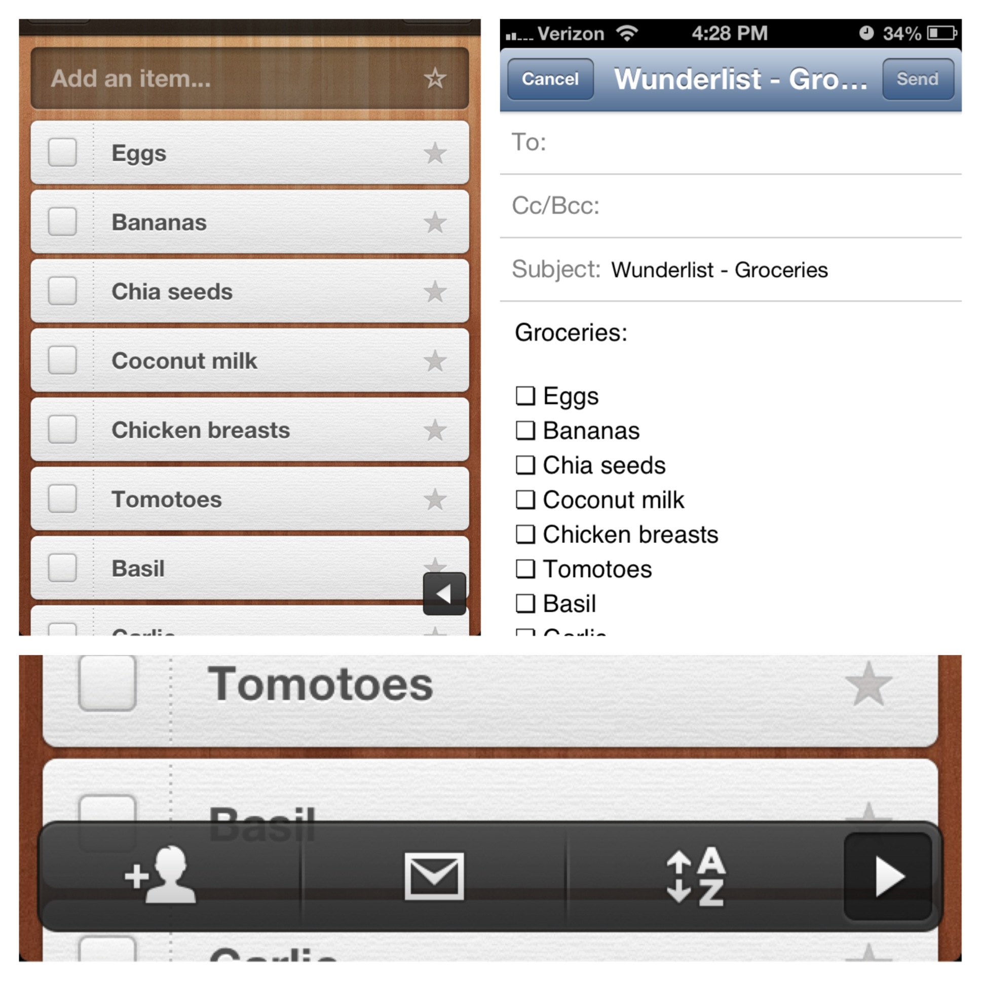 If you click on the little arrow in the bottom right hand corner, it gives you the options to share ownership of the list with someone, email the list to someone, or organize the list alphabetically. If you click to share the list with someone, they are able to add items to your list or cross things out. This could be great for sharing with a roommate a list of communal things you both need, such as paper towel. Or, you can click to email your list to someone and an email with your bulleted list pops up. I used it to send a list of groceries to my mom for an upcoming vacation.